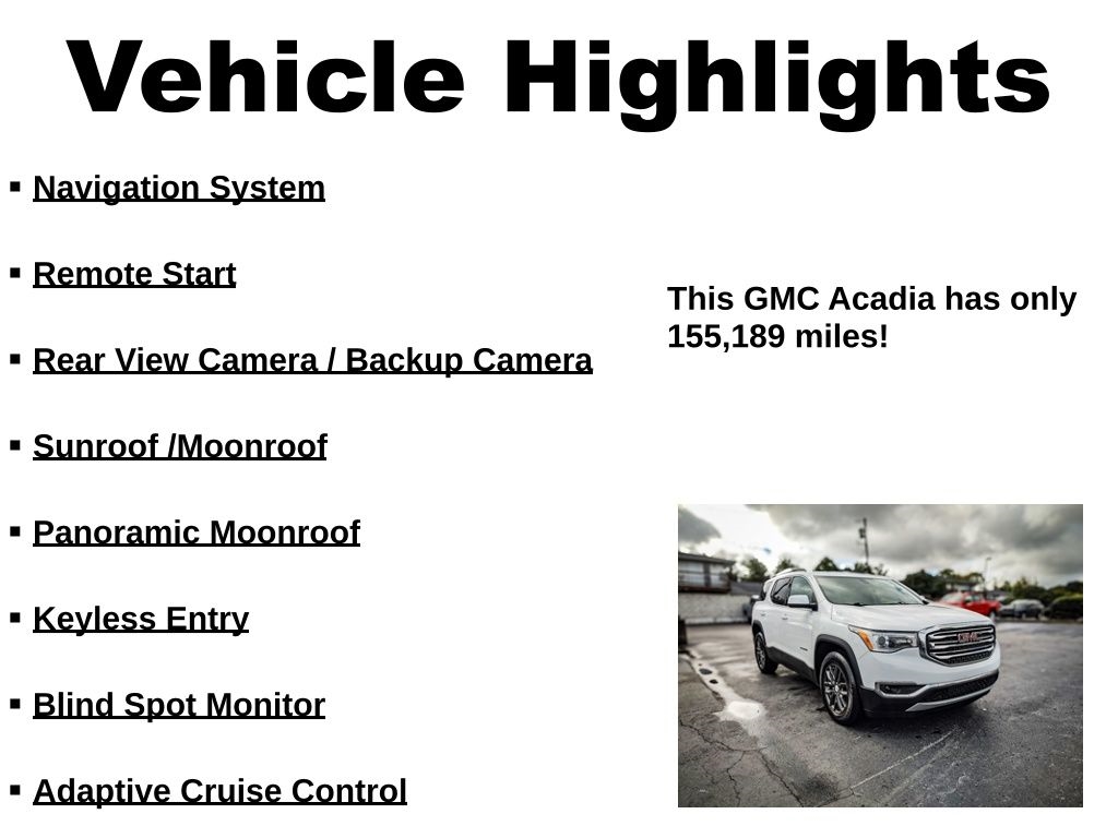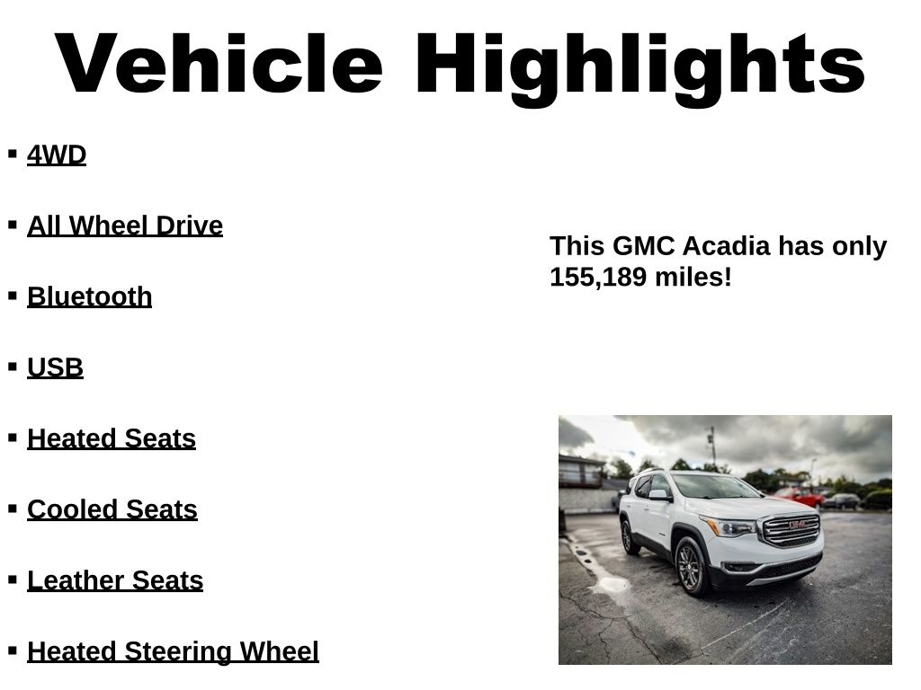 WE ARE THE LARGEST LUXURY PRE-OWNED DEALER IN KENTUCKIANA WITH 49 YEARS OF EXPERIENCE, A+ BBB RATING! THIS GMC ACADIA SLT PKG IS CERTIFIED BY CARFAX – NO ACCIDENTS! ** AWD/4X4/4WD ** LOCAL TRADE ** NON SMOKER & GARAGE KEPT ** IMPECCABLE SERVICE RECORDS ** SUPER CLEAN INSIDE AND OUT ** COMES WITH A PHENOMENAL PREVIOUS OWNER RECOMMENDATION ** LOADED UP WITH AL THE OPTIONS ** EVERY VEHICLE LOOKS GREAT IN PICTURES... BUT ON A SCALE OF 1-10, MOST DEALERS SELL A 5 OR 6. WE ONLY SELL A 9 OR 10!! ** THIS VEHICLE IS LIKE NEW AND NEEDS ABSOLUTELY NOTHING. WHY PAY MORE WHEN YOU CAN'T TELL THE DIFFERENCE? WHY BUY NEW WHEN YOU CAN BUY SUPERIOR QUALITY FOR LESS?! WE'RE KNOWN IN KENTUCKIANA FOR CLEAN, LIKE-NEW VEHICLES INSIDE AND OUT, AND OUR GOOGLE REVIEWS PROVE IT. STOP SHOPPING AND START DRIVING TODAY! OUR INTERNET SPECIAL IS PRICED TO MOVE QUICKLY, SO DON'T WAIT! ANY QUESTIONS? CONTACT JIMMY SMITH OR RICHARD SPAN AT 812-280-8018.THE GMC Acadia HAS BEEN INSPECTED BY COOPER AUTOMOTIVE WITH A THOROUGH 110-POINT INSPECTION TO ENSURE TOP-NOTCH QUALITY. OUR VEHICLES ARE THE CLEANEST IN KENTUCKIANA—LET US SHOW YOU THE DIFFERENCE!